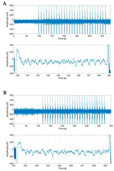 Frontal electrocorticogram (ECoG) features during stimulation of the claustrum surrounding areas showing slow-wave activity with no burst suppression pattern appearance. (A) ECoG slow-wave activity during stimulation of the area located at 5.2 mm below the cortex surface, 1.76 mm anteroposterior, and 4 mm medio-lateral. (B) ECoG slow-wave activity during stimulation of the area located at 5.8 mm below the cortex surface, 1.76 mm anteroposterior, and 4 mm mediolateral.