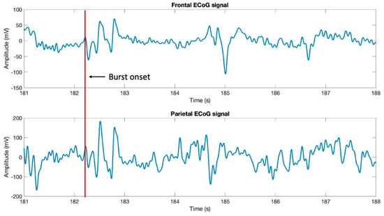 Left frontal and parietal electrocorticogram signals. These recordings show a simultaneous appearance in burst suppression pattern, as marked by the red line.