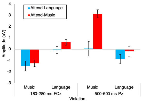 180–280 ms: A significant negative waveform was observed for the music violation but not for the language violation. The within-subjects effect of Violation showed a significant difference between music and language violations (F(1,33) = 33.198, p < 0.001). The between-subjects effect of Attention was not significant (F(1,33) = 1.381, p = 0.248). There was no significant interaction between the Violation and Attention factors (Figure 2). Tests of between-subjects effects showed no significant difference between the Attend-Music and the Attend-Language conditions (Figure 3).