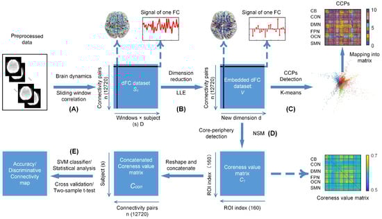 where adjacency matrix A, which could be obtained via calculating the embedded representation V of the dFC dataset with the KNN algorithm and is a permutation such that . In other words, if for each k, we regard as peripheral nodes and as core nodes, then measures the ratio of periphery-periphery links to periphery-all links. Hence, x reveals a strong core-periphery structure if remains small for large k. The value x varies per iteration of the NSM algorithm until [33]. Thus, the obtained core-periphery value vector was used to depict the topological organization of the CCPs for each participant (Figure 1D). This core-periphery approach has been proven to outperform previous core-quality function optimization methods: Degree, Perron, and Sim-Ann algorithm proposed in [37].
