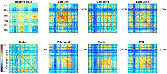 More important connectivity in the core-quality value matrix was assigned a larger value within all the connectivity. The NSM algorithm assigned the node (connectivity) core-quality values with the core-quality value vector c and we rearranged the core-quality vector c into the core-quality matrix C using the ROI-based connectivity index in the brain template. Then, the rows and columns of the matrix C represent the ROI index in the brain template. After rearrangement using this rule, the elements in the matrix C quantify the importance of the functional connectivity in the whole scanning procession between ROIs. Consequently, the functional connectivity NSM value matrices for the resting state and 7 tasks were obtained and shown in Figure 3. The important functional connectivity nodes can be directly perceived in the matrices. In the resting state, nearly all the connectivity nodes show an even distribution level. However, the connectivity between the cingulo-opercular network and sensorimotor network expresses the obvious peripheral influence on the connectivity. With clear distinctions from the resting state, the cingulo-opercular network in all the 7 tasks’ core-quality matrices presents similar peripheralization and displays the lowest interaction with other networks. Meanwhile, the ROI-based connectivity among the default network, fronto-parietal network and occipital network has a larger core impact. If we look at the 7 tasks’ core-quality matrix in detail, the core-periphery quality configuration is unique in one particular task. For example, the network interaction with the default network and sensorimotor network represents a more key impact in the motor task.