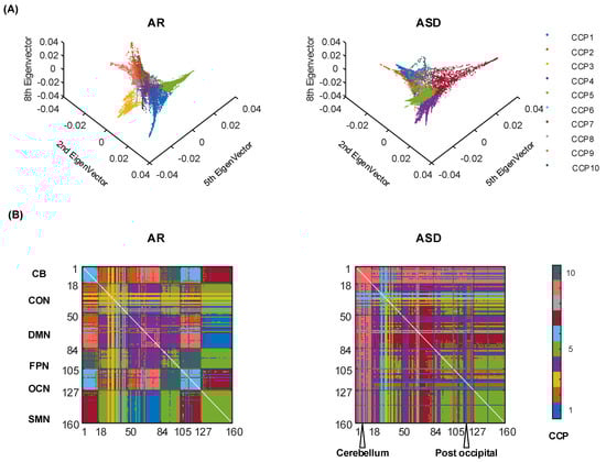 The CCPs for AR and ASD state. (A) The manifold structures of the CCPs for AR and ASD states are displayed in 2nd, 5th and 8th dimensions. (B) The CCPs in the ROI-ROI index matrix reveal the functional couplings in the networks.