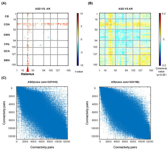 The two-sample t-test and permutation test for the ASD and AR states. (A) The two-sample t-test discrimination maps for ASD and AR states. (B) The permutation test discriminative coreness value map under . (C) The adjacency matrix for ASD and AR groups. The non-zero values of the matrix are tagged on the top of the matrix.