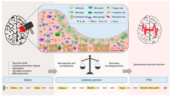 Temporal development of post-traumatic epilepsy (PTE). Traumatic brain injury (TBI) initiates a cascade of pathological processes including neuronal death and neuroinflammation, characterized by cytokine and chemokine upregulation (IL-1β, TNFα, IL-10 and CCL2), BBB dysfunction (endothelial cell disruption and red blood cell infiltration), activation of astrocytes and microglia, and infiltration of blood-derived leukocytes into the brain, including monocytes, macrophages, neutrophils and T-cells (please refer to Section 2 for further details on these factors). These processes may also influence chronic outcomes such as the development of PTE, which occurs across three phases. The first phase is the initial insult and the associated molecular and cellular mechanisms within the subsequent minutes to days. Next is a latency period (days to years after the primary injury). During this time, injury-induced neurogenesis and neuroplasticity contribute to repair and regrowth, while simultaneously, ongoing secondary injury processes promote neurodegeneration. Neuroinflammation is a key player in this response, and is thought to facilitate hyperexcitability in the brain which may ultimately result in spontaneous, recurrent seizures characteristic of PTE.