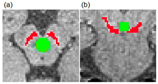 Presentation of areas for signal intensity (SI) analysis in the transverse (a) and coronal (b) planes. SISN and SIbackground were defined as shown with red and green colors, respectively. SN: substantia nigra.