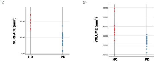 Scatter plots of the surface (a) and volume (b) of the segmented substantia nigra (SN). Distribution of the substantia nigra (SN) surface (a) and volume (b) data indicates that both the surface and volume of the SN is lower in patients with Parkinson’s disease (PD) in comparison to healthy controls (HC).