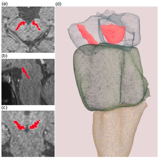 Example of semi-automatic segmentation of a substantia nigra (SN) on T1-weighted spectral pre-saturation with inversion recovery (SPIR) images. Red-colored areas represent segmented SN. Transverse, sagittal, and coronal planes are presented in (a–c), respectively. A 3D model of the brainstem (presented as a transparent structure for better visualization) and SN (colored in red) are shown in (d). A full example of the 3D model is included in Supplementary Files.