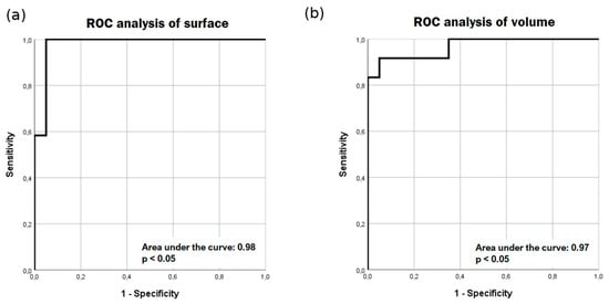 ROC analysis was performed for surface and volume results (Figure 5). In the ROC analysis of the surface, at the cut-off value of 49.2 mm2, the sensitivity and specificity were 91.7 percent and 95 percent, respectively. In ROC analysis of volume, at the cut-off value of 287.9 mm3, the sensitivity and specificity were 91.7 percent and 90 percent, respectively.