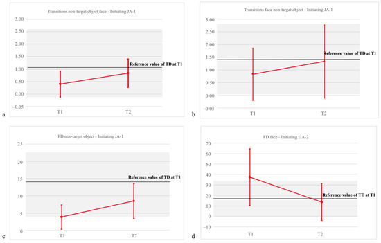 Significant longitudinal changes (with SD) in eye tracking measures in the ASD group. For the purpose of comparison, the reference values in the TD group are reported as a black line. (a) Change in transitions from non-target object to face in the Initiating JA-1 task; (b) change in transitions from face to non-target object in the Initiating JA-1 task; (c) change in fixation duration at non-target object in the Initiating JA-1 task; (d) change in fixation duration at face in the Initiating JA-2 task.