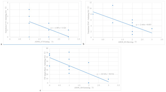 Finally, for the IJA-2, it was observed that ADOS_A8-Gesturing at T1 was an independent predictor of FD at target object at T2 (β = −0.64, adj-R2 = 0.34, p = 0.035) (Figure 3c).