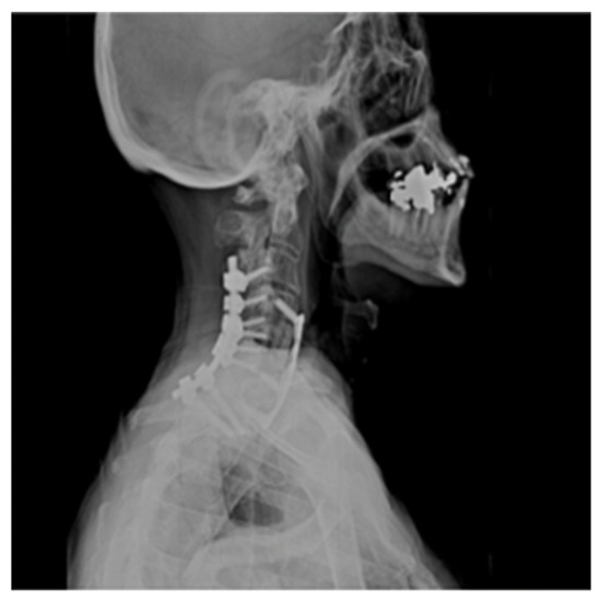 The patient was admitted to the intensive care unit and Mean Arterial Pressures (MAPs) were maintained at 90 mmHg, and he was fully anticoagulated with a heparin drip. He, however, developed significant airway edema and respiratory distress within 24 h after anticoagulation and hypertensive therapy. The patient thus required emergent intubation and subsequent operative hematoma evacuation. Lateral radiograph 1-year post operation shows C4–C7 fusion hardware and resolution of hemodynamic instability (Figure 4).