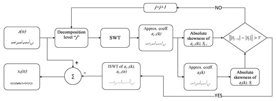 For automatic stoppage of SWT when it reaches the blink artifact components, we have applied a criterion based on the absolute difference of the absolute skewness values of two consecutive approximation coefficients levels. The block diagram of the proposed algorithm is shown in Figure 2.