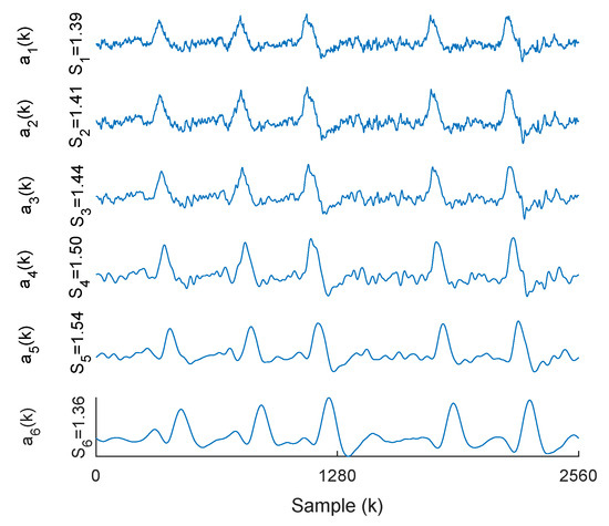 Examples of approximation coefficients and corresponding skewness values for a contaminated EEG signal from CHB-MIT database in SWT domain.