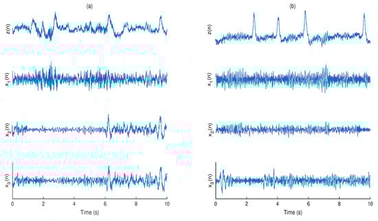 Examples of eye blink cancellation in simulated EEG signals from: EEG-MAT (a), and CHB-MIT (b) databases: z(n)—contaminated EEG, r(n)—real eye blink artifact, x(n)—pure EEG, —filtered EEG by the proposed method, —filtered EEG by the AWICA and —filtered EEG by the EAWICA.