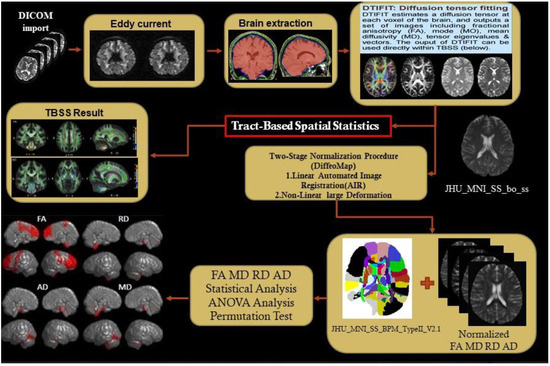 Figure 2 illustrates the flow of the DTI analysis. We used two software packages to preprocess the diffusion tensor image: (1) FSL (FMRIB Software Library, FMRIB, Oxford, UK; https://fsl.fmrib.ox.ac.uk/fsl/fslwiki) to perform the eddy current correction, Skull stripping (Brain Extraction Tool), and compute four DTI measurements and (2) Diffeomap implanted in MRI studio was used to normalize the DTI images. After the normalization of the DTI images, TBSS was used to improve the sensitivity, objectivity, and interpretability of analysis of the multi-subject diffusion images [34]. There were four core steps in TBSS: (1) Select a common registration target image, namely, FMRIB58_FA in this study, and then use the nonlinear registration method to register the preprocessed images with the target image, (2) average all post registration FA images and then compress the averaged FA map by using the non-maximum suppression method to produce the averaged FA skeleton map [35], (3) identify the maximum FA in the perpendicular direction on the averaged FA skeleton and then use all the maximum FA values to constitute an FA skeleton of the participants, and (4) use a threshold to filter out the lower averaged FA and the larger variation. The threshold FA was set as 0.2 for separating gray matter and WM to facilitate the final voxel level statistical analysis.