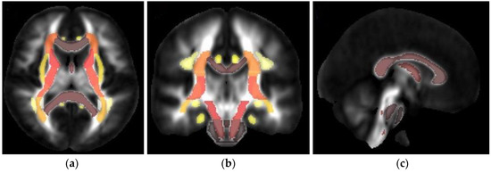 Tract-based spatial statistics (TBSS) result of DTI in the regions of interest in the JHU-ICBM-labels atlas: (a) axial view, (b) coronal, and (c) sagittal view. Colors represent the direction of the fiber tract: dark-brown, left–right; yellow and light brown, anterior–posterior; and red, superior–inferior.