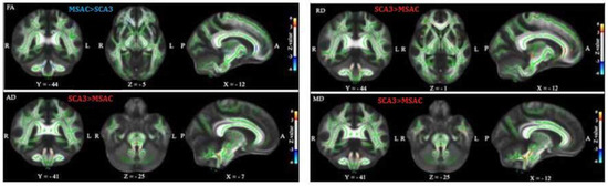 In this study, we used noninvasive DTI to explore WM integrity in the control, SCA3, and MSA-C groups and computed the FA, AD, RD, and MD in each group. The ANOVA results revealed significantly differences in the FA, AD, RD, and MD of various regions including the frontal and temporal lobes and cerebellum. In the TBSS analysis, we found increased FA and decreased AD, RD, and MD in many of the WM regions, and these results were consistent with the previous SCA3 [15] and MSA-C [18,41] TBSS studies.