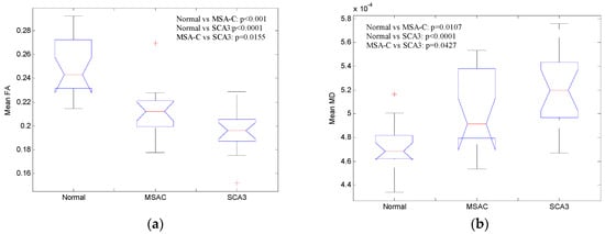 Several studies have indicated that patients with SCA3 or MSA-C exhibit the same atrophied regions, such as those in the cerebrum, pons, vermis, frontal gyrus, temporal gyrus, and basal ganglia [13,14,15,16,17,18,19,20,21,22,23]. Moreover, they share similar manifestations, including ataxia, pyramidal and extrapyramidal signs [24]. Clinically, MSA-C and SCA3 cannot be differentiated based on the clinical symptoms or T1-weighted magnetic resonance imaging (MRI) images [25]. Hence, an accurate diagnosis of SCA3 and MSA-C requires genetic testing [24]. Changes in the DTI images of patients with SCA3 or MSA-C have been reported previously [15,16,26]. However, most of the reports have mainly focused on the cerebellum and brainstem of patients with SCA3 or MSA-C and only described the differences between patients with MSA-C or SCA3 and the healthy controls. Thus far, the investigation of DTI on the whole brain (cerebrum, cerebellum, and brainstem) for differences between SCA3 and MSA-C is still unexplored. Thus, we used DTI to quantify the WM of patients with MSA-C and patients with SCA3 and aim to evaluate the efficiency of DTI in detecting differences between SCA3 and MSA-C.