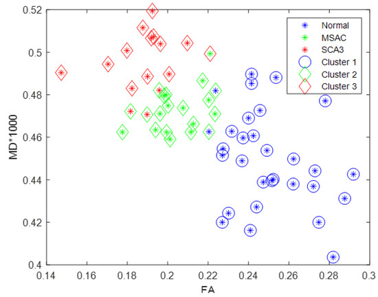 We subsequently rescaled mean MD of cerebral and cerebellar WM of each participant by 1000, such that this value (between zero and one) was comparable with mean FA of cerebral and cerebellar WM. Figure 7 illustrates the scatter plot of FA (x axis) versus MD (y axis) for all participants by K-means clustering method. The control, MSA-C, and SCA3 groups were disproportionately distributed and could be separated linearly. Therefore, the concurrent use of FA and MD can be an effective feature for differentiating SCA3 and MSA-C cases, even though SCA3 and MSA-C are both cerebellar ataxias and share many common atrophied regions in the cerebral and cerebellar cortices.