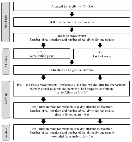 Participants included 36 healthy young adults (mean age = 21.2 years, SD = 0.7 years). All participants were strongly right-handed, as based on the Edinburgh handedness inventory []. Inclusion criteria were that participants had no previous experience with the ball rotation activity used in the intervention and no previous diagnosis of a neurological disorder. All participants gave informed consent prior to the study. The experimental protocols were approved by the Institutional Ethics Committee of Ryotokuji University (approval number 2622), and the tenets of the Declaration of Helsinki were followed.