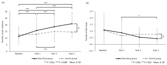 For the number of ball drops, no main effect for the variables of session and group was shown; however, there was a significant interaction (session × group) (F (3, 102) = 4.08, p = 0.009, η2 = 0.11). In the post hoc analysis for the describing groups, the number of ball drops in Post 3 was significantly lower than that in Post 1 (p = 0.02). Additionally, in Post 3, the number of ball drops in the describing group was significantly lower than in the control group as shown in Figure 2b (p = 0.005).