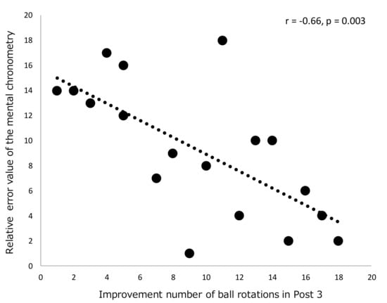 Scattergram showing the relationship between the improvement number of successful ball rotations in Post 3 and the relative error value of the mental chronometry in the describing group (n = 18, Spearman’s rank correlation).