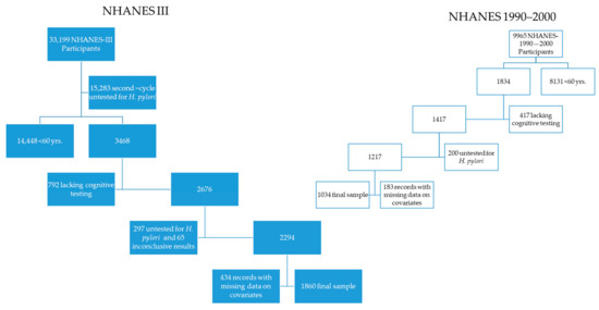 - From the 33,199 records of the NHANES-III, the authors sequentially excluded 17,916 records from the second cycle of NHANES III (1992–1994) lacking data on H. pylori infection, 14,448 subjects <60 years of age, 792, with incomplete cognitive testing, 1050 without data on H. pylori infection, 66 with equivocal infection status, and the following records with missing data on poverty to income ratio (n = 310), on blood pressure measurements (n = 34), on alcohol drinking (n = 72), on self-reported medical diagnosis of diabetes mellitus (n = 2), on C-reactive protein (n = 6), on years of education (n = 10), and on sp-MMSE results (n = 15), persons with self-reported race as other/mixed (n = 30), missing data on place of birth (n = 2); after these exclusions, 1860 NHANES-III records remained in our study.