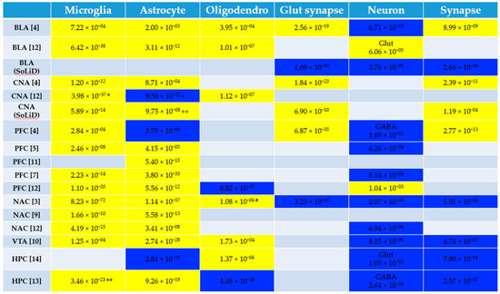 Cell Type Enrichment Results. We determined whether genes preferentially expressed in specific cell types were enriched in the genes differentially expressed between alcohol-dependent and control brain tissue using the userlistEnrichment function from the WGCNA package in R (see Methods). The human alcohol gene expression datasets are the rows (brain region of the dataset is shown in the first column) and the cell types are columns. Yellow indicates that the genes preferentially expressed in the cell type are up-regulated in alcohol-dependent brain tissue and blue indicates genes preferentially expressed in the cell type are down-regulated in alcohol-dependent brain tissue (Bonferroni-corrected p < 0.05). The p values associated with the enrichment are shown. If a cell type had more than one cell type marker gene list associated with it (from multiple publications, for example), the most significant p value is shown in the figure. See Table S2 for the full table of p values resulting from the enrichment analysis for all datasets. Some of the cell types were enriched in both the up-regulated and down-regulated datasets. The direction chosen for the figure was based on a more significant enrichment and greater number of enriched datasets for that cell type if applicable. These occurrences are denoted in the figure and described below. * Type I microglial genes were enriched in the down-regulated genes: purple_M4_Microglia(Type1)__CTX (p = 4.61 × 10−5) and pink_M10_Microglia(Type1)__HumanMeta (p = 6.43 × 10−5). ** magenta_M8_Microglia(Type2)_MouseMeta genes were enriched in the down-regulated genes (p = 3.11 × 10−7). + Astrocyte_probably__Cahoy genes were enriched in the up-regulated genes (p = 0.000178). ++ brown_M15_Astrocyte__CTX genes were enriched in the down-regulated genes (p = 0.00131). # Oligodendrocyte_probable__Cahoy genes were enriched in the down-regulated genes (p = 9.75 × 10−5). Note that Oligodendrocyte_definite__Cahoy genes were enriched in the up-regulated but not down-regulated genes for this dataset. BLA: basolateral amygdala, CNA: central nucleus of the amygdala, PFC: prefrontal cortex, NAC: nucleus accumbens, VTA: ventral tegmental area, HPC: hippocampus, Glut: glutamatergic.