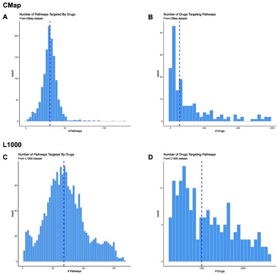 Drug-Pathway Prediction Results. We determined whether genes within KEGG pathways (within the MSigDB v6.2 dataset) were significantly up-regulated or down-regulated by drugs in CMap and L1000 databases using Gene Set Enrichment Analysis (GSEA). We downloaded the drug gene expression signatures for CMap from ftp://ftp.broadinstitute.org/distribution/cmap/ (amplitudeMatrix.txt) and the L1000 signatures from Gene Expression Omnibus (Level 5 data; Phase I: GSE92742, Phase II: GSE7013). Histograms of the number of pathways predicted to be targeted by drugs in CMap (A) or L1000 (C) databases. Histograms of the number of drugs in CMap (B) or L1000 (D) databases predicted to target pathways. The blue dashed line represents the median number of pathways in A and C or drugs in B and D.