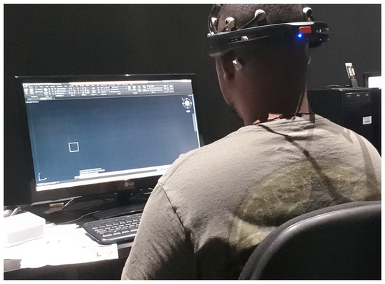 A subject is using AutoCAD and wearing EEG headset in real experimental setting.