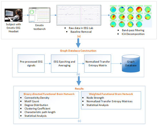 Normalized Transfer Entropy Framework (a) EEG data acquisition and pre-processing, (b) Transfer Entropy calculation and graph database construction, and (c) Result and analysis of binary and weighted FBNs.