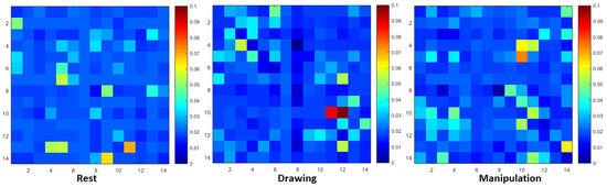 The NTE matrices of size 14 × 14 were calculated as shown in Figure 3 and Figure 4. Figure 3 shows the NTE matrix of a novice user with three different design states and Figure 4 shows the NTE matrix of an expert user. The cluttered and brighter pixel shows the increase in information flow. From the NTE matrices, it can be inferred that the information flow pattern of the user changed and increased from the baseline rest condition. Due to space limitation and maintain the readability of the paper, the results of two novice and two expert users have been shown in this paper instead of the entire cohort. Most of the figures and tables in this section show the results of some particular participants.