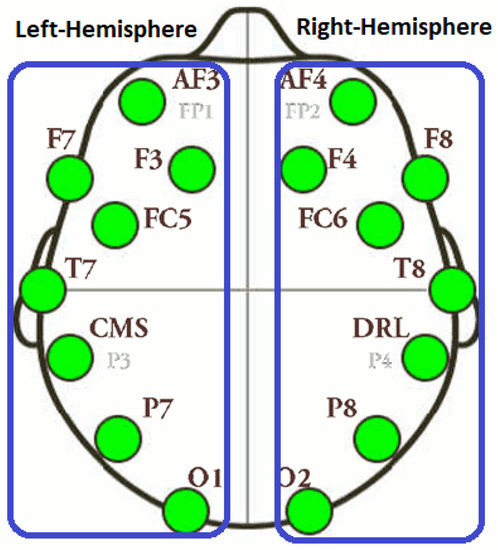 The hemisphere analysis has been performed to identify the information flow patterns within and between the left and right hemispheres. For this analysis, we have divided 14 EEG electrodes into two sets of 7 electrodes that correspond to each hemisphere. The electrodes belong to left hemisphere (LH) and right hemisphere (RH) are shown in Figure 5.