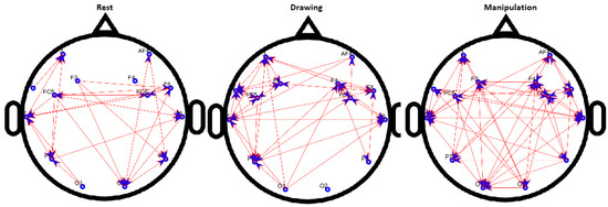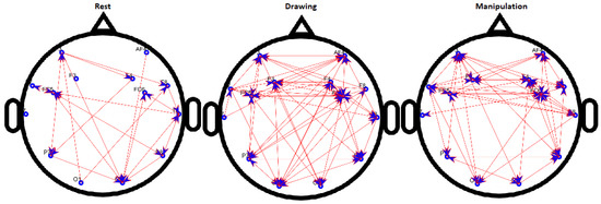 The results of binary directed FBNs are shown in Figure 8 for a novice user and Figure 9 for an expert user. For the novice, the connections between electrodes increase when participants move from rest to drawing and from drawing to manipulation. Whereas, connections increase from rest to drawing and no significant change was observed from drawing to manipulation for expert users.