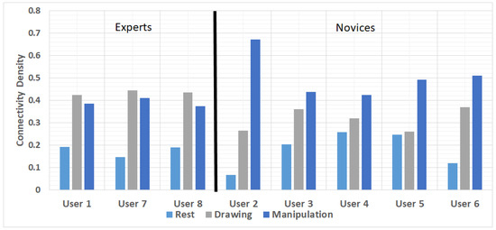 - The network density increased from the baseline for both novice and expert users, but the change is more for novice users compared to experts in drawing and manipulation states.