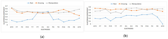 Clustering coefficient of all electrodes for novice and expert users during rest, drawing and manipulation states. (a) User 3 (A representative novice user). (b) User 8 (A representative expert user).
