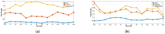 Comparison of node strength across electrodes during rest, drawing and manipulation states. (a) User 3 (Novice). (b) User 8 (Expert).