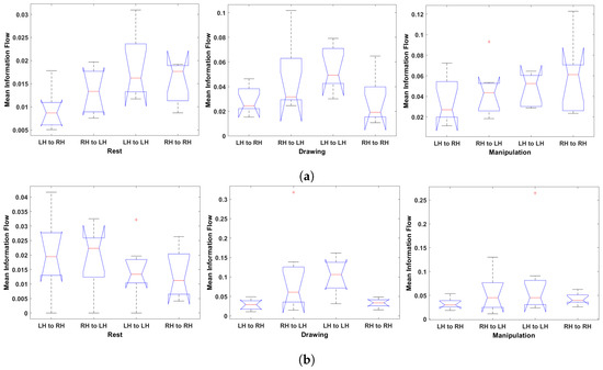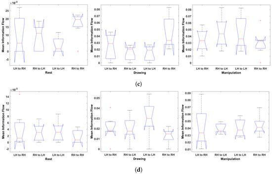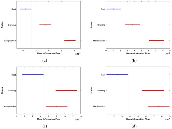 Figure 15a–d shows the ANOVA test results for hemisphere-wise analysis. The results show that the information transfer from LH to LH is greater than the information transfer in other hemispheres for expert users 7 and 8 in drawing state. In manipulation state, the t-test results showed that there are no significant differences in mean information transfer value for RH to RH and RH to LH transfer. For user 7, the values of RH to LH and RH to RH increased in manipulation state compared to drawing state. User 8 shows an opposite behavior, the mean information flow value from RH to LH and LH to LH decreases in manipulation state and other information transfer values do not change much. In case of the novice users, an increase in information flow in all the electrodes was observed from rest to drawing to manipulation state. The flow of information is more towards the left hemisphere from the right and left hemisphere electrodes. Thus, it can be said that, in manipulation state, the left region of the brain has received more information from its own electrodes then the right-side electrodes.