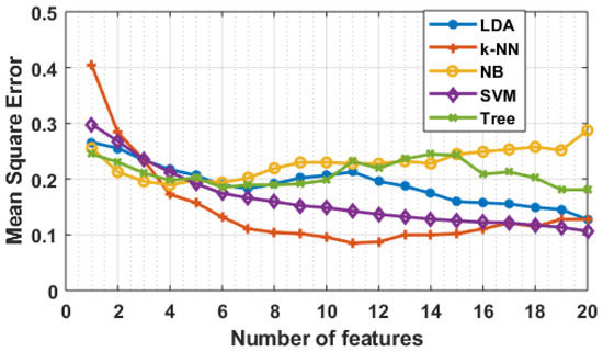 Figure 16 shows the mean square error (MSE) of various classification algorithm with respect to the features selected. The graph shows that the error decreased when the number of features increased. After selecting a certain number of features, the change in MSE was not significant. The least MSE of 8% was observed with k-NN classifier and NB shows the maximum MSE compared to other classifiers.