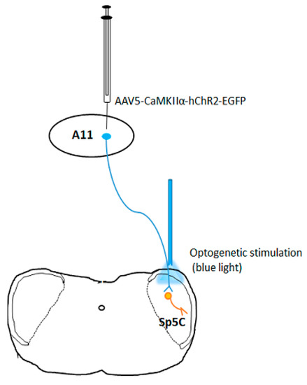 Optogenetic manipulation can produce circuit-specific neuromodulation by overexpressing light-sensitive proteins (opsins) in particular cell types of interest. This is accomplished either by the use of viral vectors that infect only certain types of neurons through cell type-specific promoters, such as calcium/calmodulin-dependent protein kinase IIα (CaMKIIα), which will localize opsins to excitatory neurons [20], or by targeted use of viral vectors that express their transgenes in a Cre-dependent manner (Cardin et al., 2010). For instance, we can inject an AAV vector with CaMKIIα promoter (AAV5-CaMKIIα-hChR2-EGFP) to specifically express ChR2 on excitatory neurons in the hypothalamic A11 nucleus and then optogenetically stimulate (with blue light) axon terminals of excitatory neurons in the spinal trigeminal nucleus caudalis (Sp5C, see Figure 1, unpublished), thereby producing specific modulation of neuronal activity in the A11−Sp5C pathway. Because depolarizing opsin ChR2, a light-gated cation channel, allows positively charged ions (primarily Na+) to flow into intracellular space to induce neuronal excitation when stimulated by blue light and conversely, the hyperpolarizing opsin eNpHR3.0, a chloride pump activated by yellow light, allows Cl- to flow into neurons to produce neuronal inhibition, it is possible to study the behavioral consequences of activating or inhibiting the same ensembles of neurons by expressing the two light-sensitive proteins on the same neurons [14].
