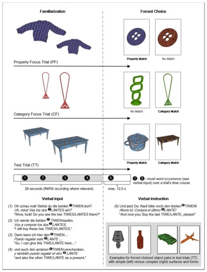The auditory input was recorded via Speech Record – AlgoRec, edited with Adobe Audition 1.0 (Adobe, San Jose, CA, USA), and monophonically presented via two loudspeakers. The verbal input consisted of four utterances followed by the verbal instruction each embedding the novel word (Figure 1, bottom). All German and Spanish sentential contexts could host either nominalized adjectives or nouns and were hence ambiguous with respect to a property (→ nominalized adjective) versus category (→ noun) interpretation. The novel words’ phonological structure also permitted either interpretation. They reflect a common structure of existing German and Spanish nouns (e.g., German: Tasch-e, “bag”; Spanish: lech-e, “milk”) or nominalized adjectives (e.g., German: der Neu-e, “the new one”; Spanish: la grand-e, “the big one”), they consisted of two syllables ending in a schwa for German (e.g., /ᴚe:fə/) and a mid-front vowel /e/ for Spanish (e.g., /nu:je/), and had a trochaic stress pattern. The novel words in the sentential contexts were inflected according to German (e.g., Refe-n) or Spanish (e.g., nuye-s) morphology. The definite articles used in the sentences matched the grammatical gender of the familiar objects and the names for the property match and category match objects were of the same grammatical gender. Thus, the definite article marking gender that they heard in the test question did not favor either of the two objects of choice. In both languages, about half of the test trials used feminine articles and the other half masculine ones. Feminine and masculine gender was balanced across trials.