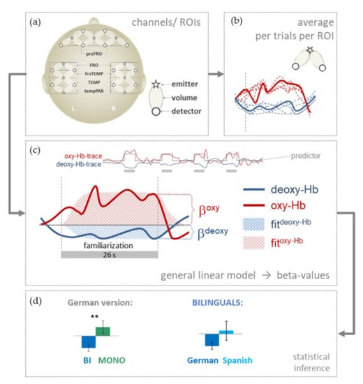(a) setup of fNIRS measurements. Sampling volumes are determined by pairs of emitting (star) and detecting probes (circle). For statistical analyses regions of interest (ROIs) were defined over each hemisphere (left, L and right, R): prefrontal (preFRO), frontal (FRO), fronto-temporal (froTEMP), temporal (TEMP) and temporo-parietal (tempPAR). (b) Means across trials were calculated for each participant, channel, and ROI to judge the overall hemodynamic response. (c) For statistical analysis, a GLM-approach was used: a box-car-predictor of the stimulus period (here familiarization with novel word, presented 4 times) was convolved with the canonical hemodynamic response function and fit to the measured data (traces). This yields b-value as illustrated in the main plot. (d) The statistics were computed according to the contrasts of interest. Left graph: bilingual versus monolingual group (BI vs. MONO in the German version). Right graph: German versus Spanish version of the task for the bilingual group).