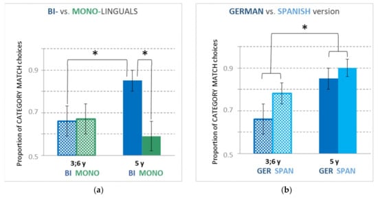 Behavioral data regarding the proportion of category match choices in the forced-choice task. Diagrams provide means and standard errors (+/−1) separately for 3.5-year-olds (checked bars, 3;6 y) and five-year-olds (full bars). Significant differences are indicated (*, p ≤ 0.05). (a) data of the German version for bilingual (dark blue, BI) compared to monolingual (green, MONO) children; (b) data of the bilingual children for the German (dark blue, GER) compared to the Spanish (light blue, SPAN) version.