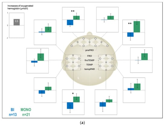 Using a linear interpolation approach, sharp rises or falls suggesting motion artifacts were corrected channel-wise. This procedure used in a number of previous infant studies [,,] requires visual inspection of every trial. In case a brisk, clearly non-physiological step in the NIRS-readings is detected, this step is marked and the data prior to and after the step are fitted replacing the artifactual step by a linear interpolation. After this procedure, data was low-pass filtered at 0.3 Hz to attenuate oxygenation changes that are related to heartbeat. After this filtering, we visually inspected all trials to enhance reliability of the artifact detection. Next, data were entered into a general linear model (GLM) yielding β-values for oxy-Hb and deoxy-Hb assuming a hemodynamic response function peaking at 5 s []. The resulting data (beta-values corresponding to µmolar changes; Figure 2c) represent the mean change in the two hemoglobins over the full trial length of 36 s compared to the (high-level) baseline. This ‘baseline’ includes both visual and auditory input. Therefore, changes in the two hemoglobins are also expected during this high-level baseline. High-level baselines may induce additional noise but are clearly preferable to ‘resting’ periods without any stimulation, especially in infant studies targeting cognitive tasks. Averages were computed for each channel in each participant (Figure 2b). Based on the variance of the data values higher than 7.0 µmol/L were classified as outliers and were subsequently excluded (<0.6% of the data). For further statistical analyses (Figure 2d), the data of different channels within each ROI was averaged (Figure 2b).