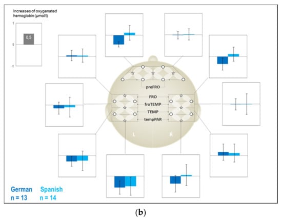 We assessed the concentration changes of oxygenated (oxy-Hb) and deoxygenated hemoglobin (deoxy-Hb) in response to the stimuli (Figure 2c). There has been substantial debate about which of the two parameters is more robust. Additionally, some authors have postulated deviations from the typical adult response in children []. Therefore, we analyzed both parameters, i.e., increases in oxy-Hb and/or decreases in deoxy-Hb, separately [].