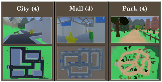 VR equipment. The VR program was run on an Asus© Zenfone 3 Laser ™ (see specificities on www.asus.com, Asus, Taipei, Taiwan) and a lightweight hand-held cardboard VR headset for viewing. The VR application run on the Android phone was designed using the 3D engine Unity© (ver. 2017.2.0.f3, Unity Technologies ApS, San Francisco, CA, USA). Twelve virtual environments (VE) were built according to three styles of: city streets, mall hallways, and park trails (see Figure 1 for samples). The virtual environments were topographically similar, with an average area of 234 square meters. Additionally, each environment had six intersections, which is a point where 3+ roads converge.