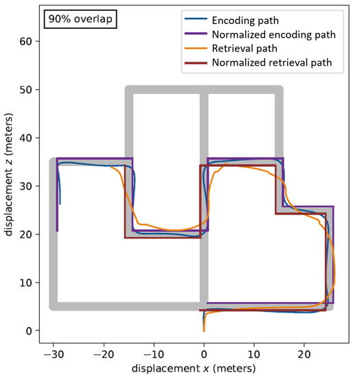 Example of the paths travelled in one of the virtual environments at encoding and retrieval before and after normalization.