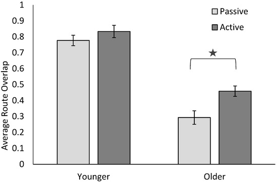 Average percent Route Overlap values for active and passive encoding in younger and older adults. Error bars represent the standard error. The star represents significant differences between active and passive conditions for older adults.