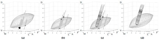 Anterolateral view of the subthalamic nucleus (STN) in an AC–PC-aligned orientation illustrating how the contact locations were expressed in reference to the generalized STN. (a) The atlas-derived generic 3D STN shape is placed on top of the patient-specific MER sites (∙ = outside STN, ● = inside STN); (b) the STN is transformed to optimally fit the classifications of all MER sites; (c) the DBS electrode and its contacts, recognized in MRI-fused CT images, are combined with the MER-based STN using the patient-specific stereotactic frame (active contact after one year in darker gray); (d) both the MER-based STN and the recognized electrode are inversely transformed together. All the electrode contacts are now expressed in reference to the generalized STN in an AC–PC-aligned orientation. (A = anterior, D = dorsal, L = lateral, M = medial, P = posterior, and V = ventral, locations displayed on the axes are in mm).