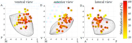 Distribution of the active contact locations after one year in a ventral, anterior, and lateral view. The gray shape represents the generalized STN, identical for all patients. Locations are color-coded corresponding to their contralateral off-medication stimulation effect. Overall, the distribution of the locations is centered on the anterior part of the dorsolateral STN. The relation with stimulation effect is most striking in the anterior view, where the locations at the lateral and ventral part of the distribution often correspond to good stimulation effect (red), while locations at the medial and dorsal part of the distribution often corresponding to poor stimulation effect (yellow). (A = anterior, D = dorsal, L = lateral, M = medial, P = posterior, and V = ventral, locations displayed on the axes are in mm).